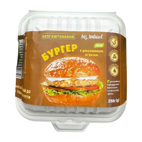 Котлета: рослинне м’ясо (вода, соєвий білок, соняшникова та кокосова олія, спеції: суміш перців, часник, цибуля, цитрусова клітковина, яблучний оцет, дріжджові екстракти, морська сіль, сік червоного буряка, 1% метилцелюлоза, пасерована цибуля, чорний мелений перець)