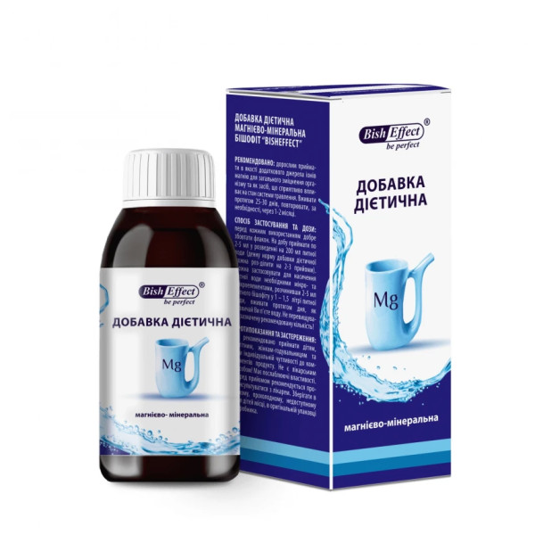 Питний бішофіт — це дієтична добавка, що містить магній у формі магнію хлориду, природного походження. Призначений для використання як додаткове джерело магнію в раціоні харчування дорослих. Формула продукту дозволяє зручно і поступово збагачувати раціон необхідними мінералами, особливо у випадках, коли потреба в них зростає (активний спосіб життя, незбалансоване харчування, сезонні зміни). Завдяки рідкій формі, добавку можна легко дозувати та використовувати як частину щоденного вживання питної води. Вона підходить для осіб, які прагнуть доповнити свій раціон мінеральними речовинами, що надходять із природних джерел.
