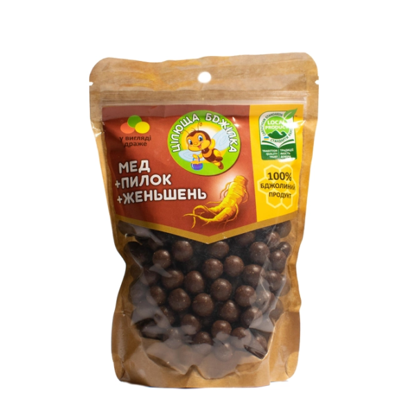 Цілюща бджілка – живильні і надзвичайно багаті корисними речовинами натуральні солодощі у вигляді драже, до складу яких входить квітковий пилок, карпатський мед, бджолиний віск, патока і солод. Драже Цілюща бджілка – смаколики, подаровані природою!Всередині драже – грудочка квіткового пилку, що містить всі необхідні людині амінокислоти, повноцінний білок, калій, залізо, кальцій, магній, фосфор, фітогормони та природні антибіотики. Зовні квітковий пилок покрита глазур'ю, до складу якої входить високоякісний мед з власної пасіки. Таке смачне поєднання цілющих продуктів володіє антибактеріальними, противірусними і омолоджують властивостями. Натуральні цукерки покриті тоненькою оболонкою бджолиного воску, містить велику кількість вітаміну A, а також є природним консерватором і забезпечує збереження біологічної цінності продукту в повному обсязі.