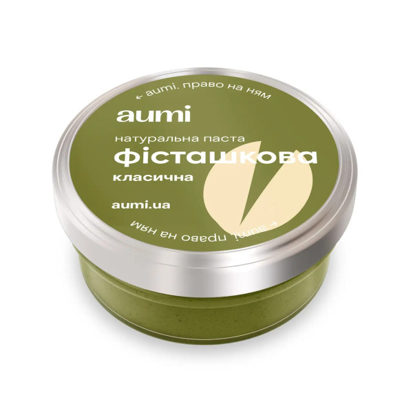 Натуральна ніжна фісташкова паста AUMi виготовляється з ядер фісташок тільки вищого сорту. Секрет неповторного смаку й аромату саме в якостях використовуваної сировини. У складі пасти тільки 100% фісташки, жодних барвників, цукру, пальмової олії. Ніжне обсмажування зберігає властивий фісташкам жовтувато-зелений колір і водночас підкреслює її смак.