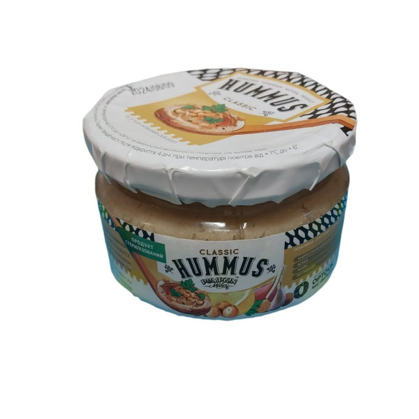 Склад: нут варений, олія оливкова, вода питна, насіння кунжуту, зіра, сіль кухонна, часник свіжий, лимонний сік.