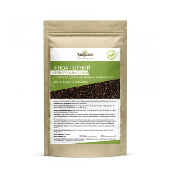 Склад: крупа кіноа чорна (квіноа, кінва). Не містить барвників, ароматизаторів, підсилювачів смаку, хімічних домішок.