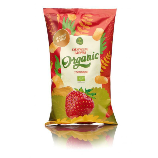 Склад: органічна крупа кукурудзяна, органічна олія, органічна цукрова пудра (виготовлена з органічного цукру), подрібнена органічна сублімована полуниця, вода питна.