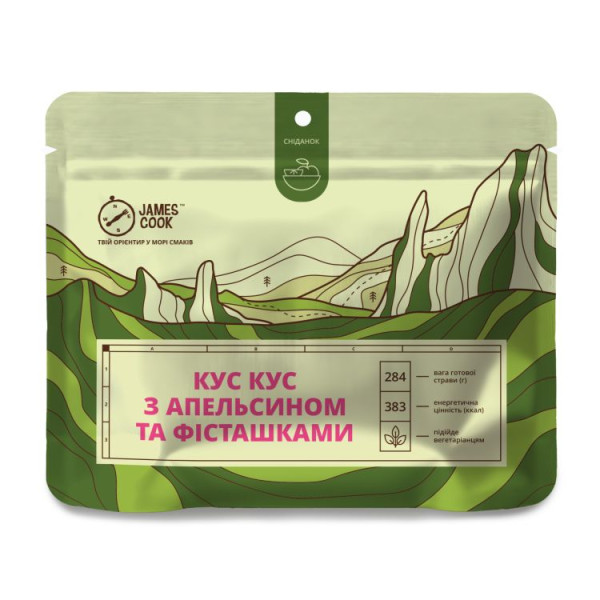 Кус-кус – традиційна крупа, популярна серед північноафриканських, близькосхідних і середземноморських культур. Ідеально підійде для активних й енергійних людей, а також для тих, хто регулярно займається розумовою діяльністю. Порція кус-кусу з апельсином, фісташками та курагою вранці наситить вас й збагатить організм необхідними вітамінами та мінералами. Для приготування використовуються лише натуральні компоненти. Жодних підсилювачів смаку, чи барвників. Страва виготовлена шляхом висушування готових продуктів. Саме тому, смак її максимально близький до тієї, що ви готуєте вдома.