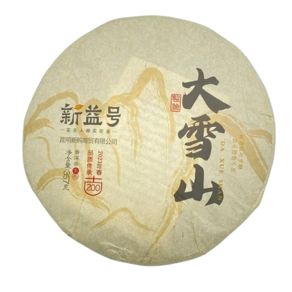 Китайський чай, шен пуер, Велика Снігова гора, торгової марки Сінь Ї Хао. Зібраний в районі Великої Снігової гори, Менку, Шуанцзян, Лінкан, Юньнань, Китай. Приготовлений на Чайній фабриці Xishuangbanna Honghai Tea Co., Ltd.. Запакований в 2023 році.