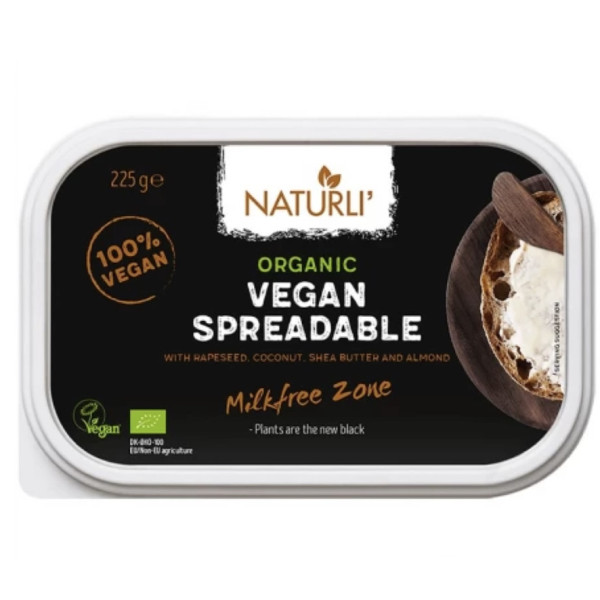 Веганьска намазка Naturlі - ваша рослинна альтернатива вершковому маслу. Виготовляється з високоякісних органічних олій і 100% не містить молочних продуктів. Смак гладкий і схожий на масло, з м'яким присмаком мигдалю. Має тверду консистенцію, але лешко намазується на хліб, щойно діставши з холодильника.
