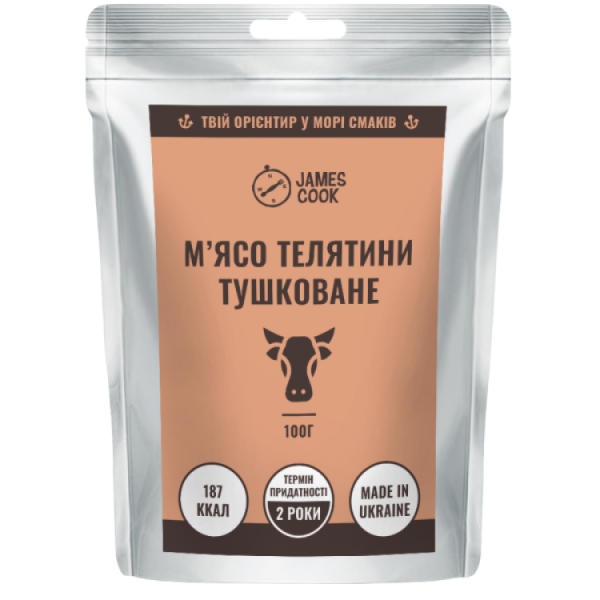 MRE Телятина тушкована у власному соку від ТМ James Cook - страва повністю готова до вживання (англ. meal, ready-to-eat). Чудово підходить як додаток до основних страв. Виготовлена способом тушкування у автоклаві. Інноваційна термостійка упаковка дозволяє зберігати готову страву до 2 років. Страву можна вживати прямо з пакету.