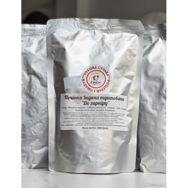 Склад: печінка індича, цибуля ріпчаста, морква, сіль, перець чорний мелений, часник мелений.