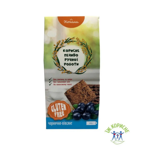 Склад: кукурудзяне борошно, вівсяне борошно, насіння соняшника, сушена чорниця, картопляний крохмаль, фруктоза, патока, ванілін, кокосове масло, сік лимона, морська сіль, розпушувач тіста.