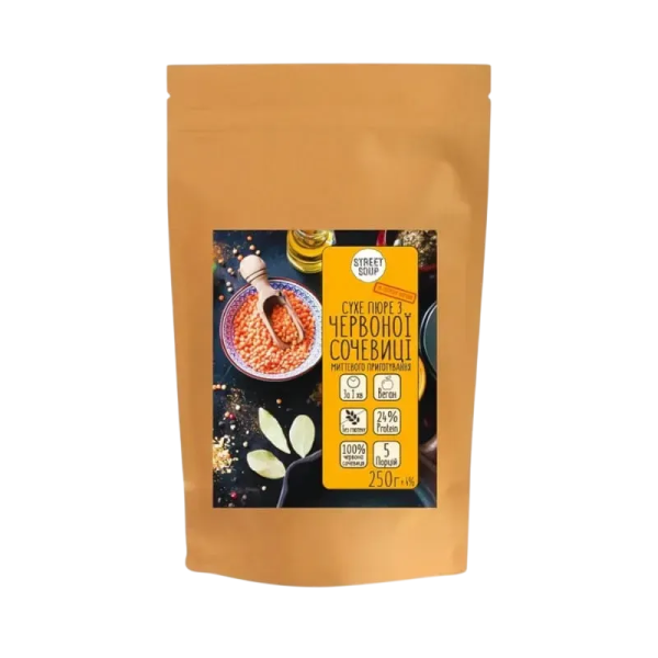 Сухе сочевичне пюре миттєвого приготування 250 г в дой-пак упаковці з zip-lock - це новий натуральний продукт миттєвого приготування в зручній упаковці з zip замком для зручного зберігання!