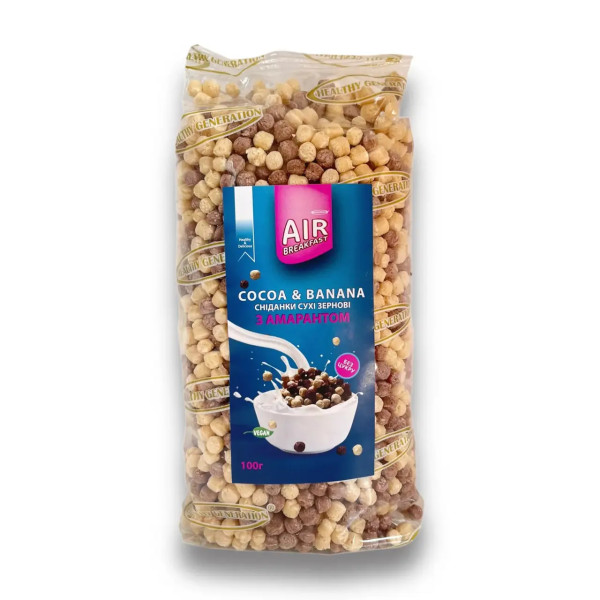 Сухі сніданки "Air Breakfast" зернові кульки з какао та бананом з амарантом, 100 г – це ідеальний вибір для смачного та корисного початку дня! Продукт готовий для споживання.